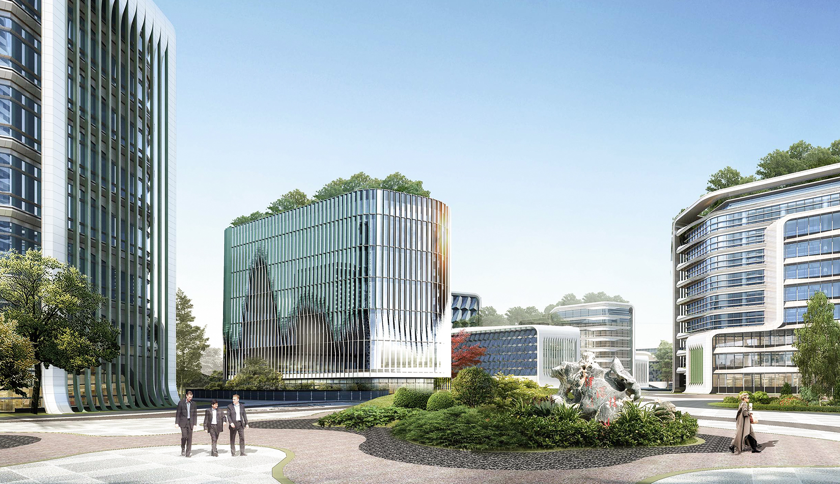 規(guī)劃設(shè)計以“曲水流觴”為理念,空間布局取“曲水流觴”場景精髓,以曲徑通幽的景觀系統(tǒng)作為主軸,以組團(tuán)布局的院士樓為節(jié)點(diǎn),完成整個園區(qū)的規(guī)劃設(shè)計。布局貫穿南北的云游步道,曲徑通幽,步移景異,人在步道上行走,猶如流動的羽觴杯,尋訪院士樓、穿行重重竹林、覓河濱綠地等景致,體會古代曲水流觴之儒風(fēng)雅俗。
